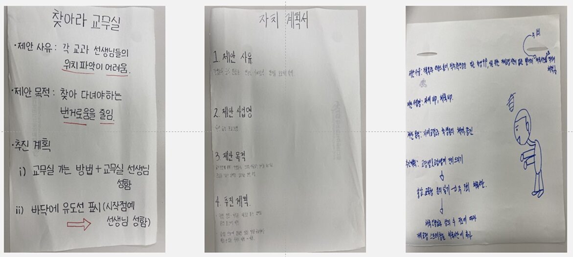 - 민주 시민이란 무엇인지 고민해보며 친구들과 조를 만들어 자치 계획서를 만드는 활동을 통해 소통의 역량을 키울 수 있었다